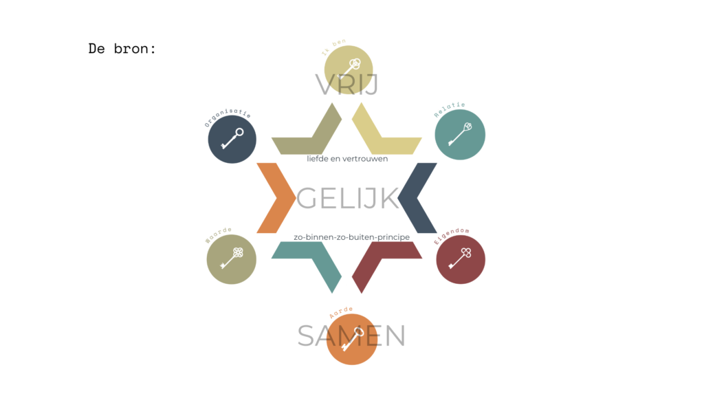 Uitgangspunt: We organiseren vanuit vrij, gelijk en samen en doen recht aan het vrije individu, met elkaar zorgen we voor ieders welbevinden binnen de gemeenschap. We werken samen op basis gelijkwaardigheid van ieders kracht, passie en verbinding geïnspireerd vanuit elkaar en de gezamenlijke bron. Ieder zoekt de eigen plek in het geheel. Als brongenoten zijn we met elkaar en met de gemeenschap verbonden door de zes sleutels: Ik ben, Waarde, Eigendom, Organisatie, Relatie en Aarde.